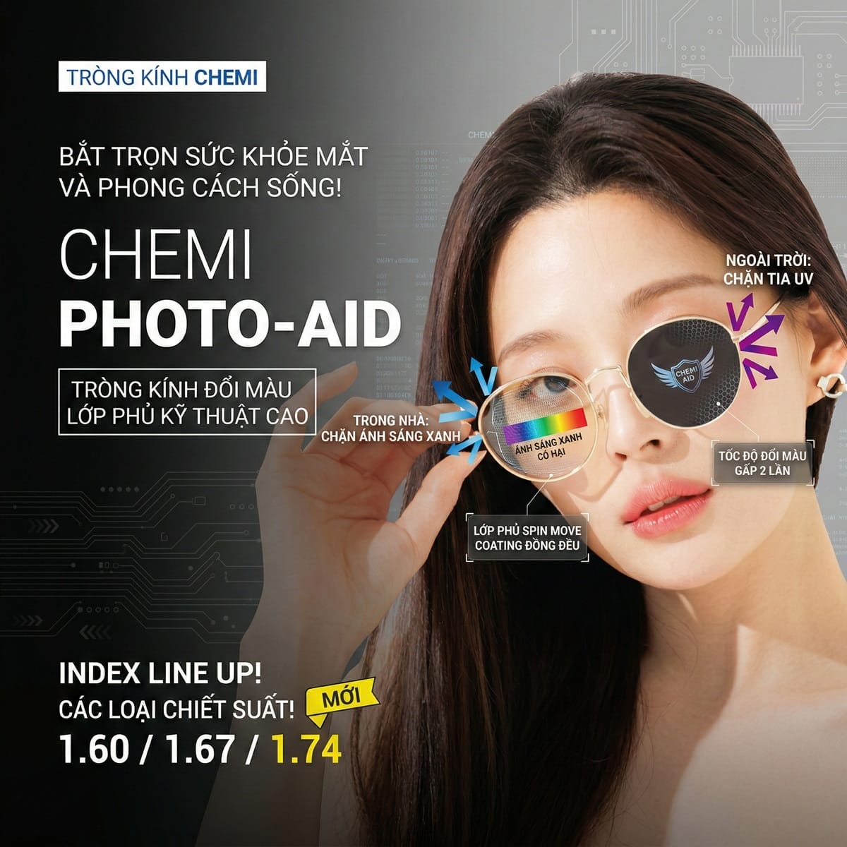 Nói dễ hiểu, với người có độ cận cao hơn, phần rìa tròng thường dày hơn phần giữa. Nếu công nghệ đổi màu không tốt, tròng dễ đậm ở rìa và nhạt ở tâm. Với Spin Move Coating, Chemi Photo Aid 1.60 hướng tới việc giảm tình trạng đó để màu chuyển tự nhiên và đẹp mắt hơn.