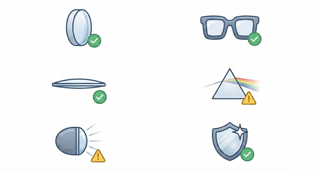 Một khác biệt quan trọng khi so tròng kính chiết suất cao 1.67 vs 1.74 là hiện tượng tán sắc, thường được nhắc qua chỉ số Abbe. Nói đơn giản: Abbe càng cao thì xu hướng thấy viền màu ở rìa càng ít. Trong thực tế vật liệu, chiết suất càng cao thường đi kèm Abbe thấp hơn, nên một số người nhạy có thể thấy viền màu hoặc cảm giác rìa “khác” rõ hơn khi dùng 1.74.
