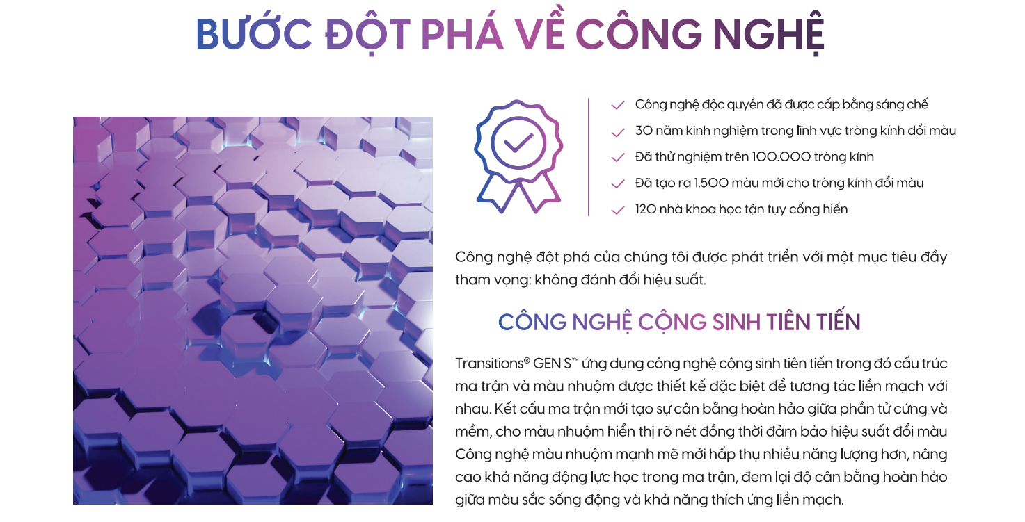 Transitions Gen 8: Nhờ 5 năm nghiên cứu, Gen 8 khi ra mắt đã được đánh giá là bền nhất từ trước đến nay của Transitions thời điểm đó. Theo Essilor, phải sau khoảng 2 năm sử dụng liên tục người đeo mới bắt đầu nhận thấy tốc độ đổi màu của Gen 8 chậm đi đôi chút. Lớp phân tử quang chromic của Gen 8 được cải tiến để chịu được nhiều chu kỳ đổi màu mà không bị giảm hiệu suất nhanh như các thế hệ cũ (Gen 7 trở về trước có thể suy giảm sau ~2 năm).