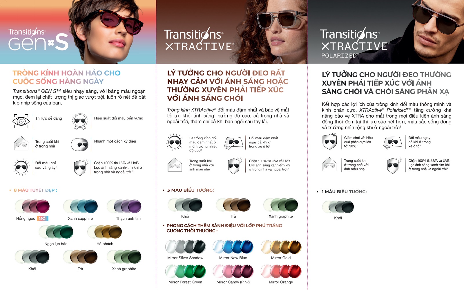 Transitions Gen 8: Cung cấp 7 màu sắc cho tròng kính. Bao gồm 3 màu truyền thống Xám (Grey), Nâu (Brown), Xanh lá than chì (Graphite Green) và 4 màu thời trang Amber (Hổ phách), Amethyst (Tím thạch anh), Sapphire (Xanh lam), Emerald (Xanh lục). Những màu “Style Colors” này giúp người đeo có thêm lựa chọn cá tính, ví dụ Sapphire cho ánh xanh thời thượng hay Amber ấm áp. Tuy nhiên, Gen 8 chưa có màu đỏ Ruby.