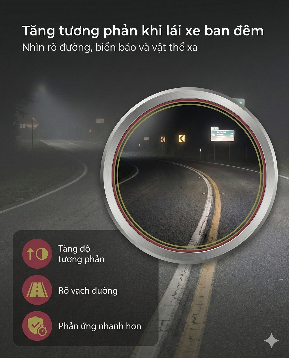 Ban đêm, mắt khó phân biệt ranh giới giữa vật thể với nền tối. Tròng tối ưu tương phản giúp nhìn rõ đường, vạch phân làn, biển báo và xe phía trước.